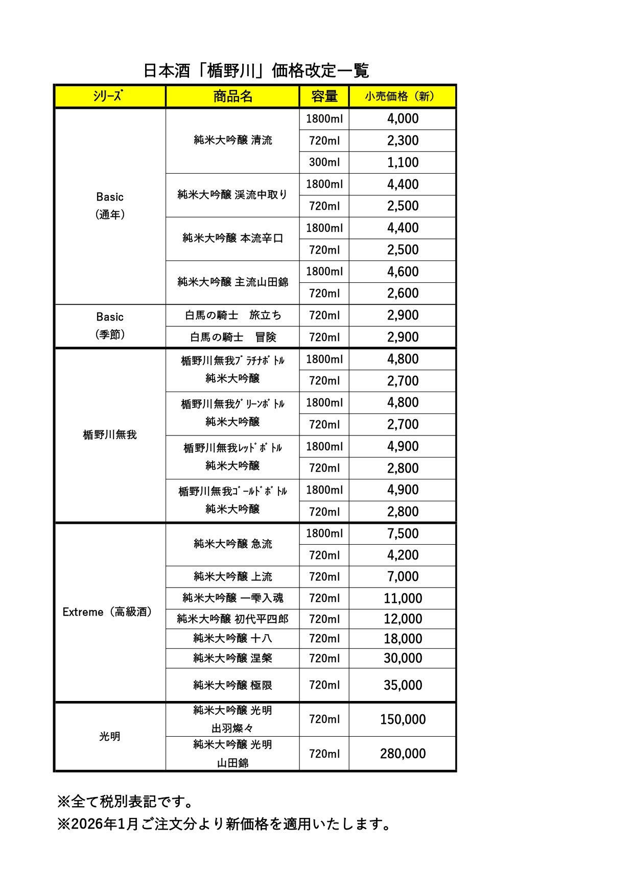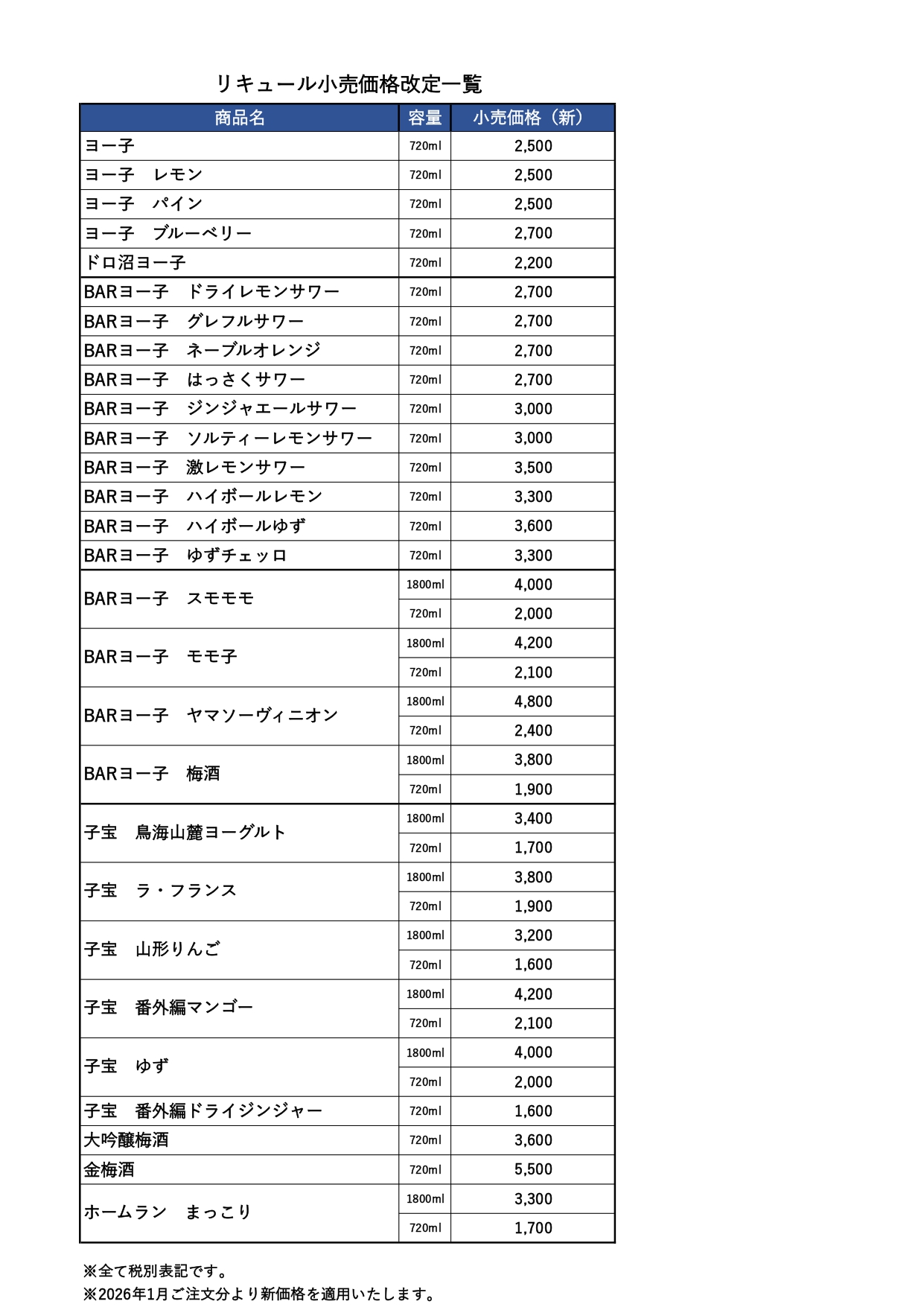 このたび、2026年1月ご注文分より、日本酒・リキュール商品の一部において価格を改定させていただくこととなりました。