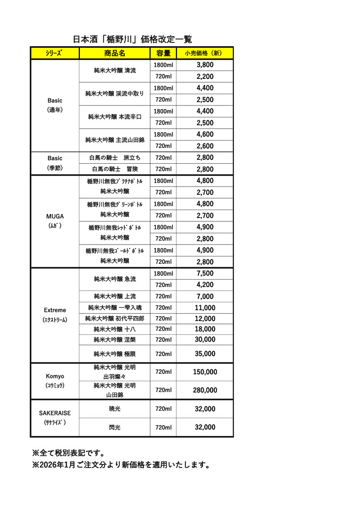 このたび、2026年1月ご注文分より、日本酒商品の一部において価格を改定させていただくこととなりました。