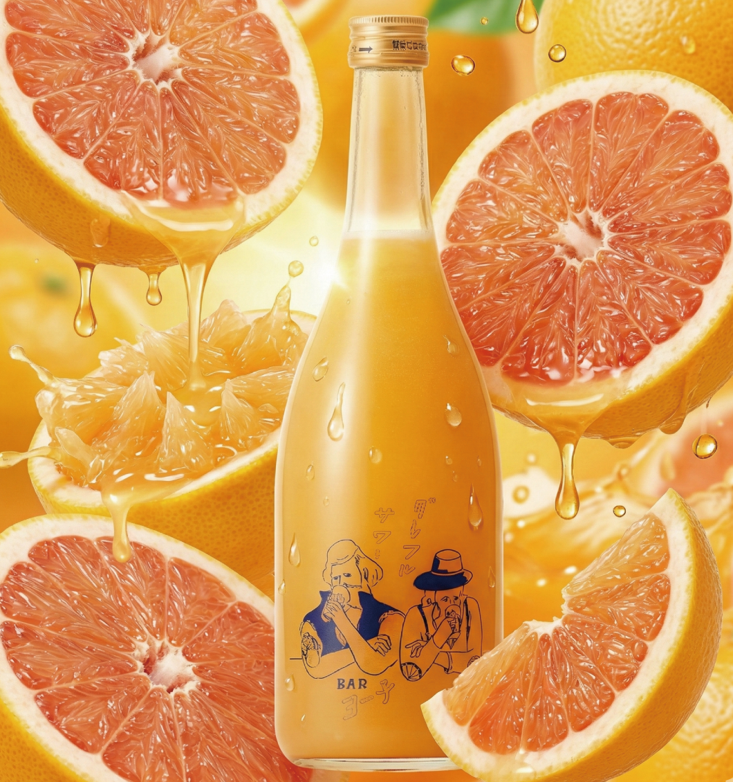 個性が違う2種類のグレープフルーツ果汁を使って、純米大吟醸を香り付け。酸味・甘味・苦味のバランスが絶妙な、まさに人生に深みを与える味です。グレープフルーツの皮ごと果汁にした「コミニュテッド果汁」の苦味は大人の舌を満足させてくれます。