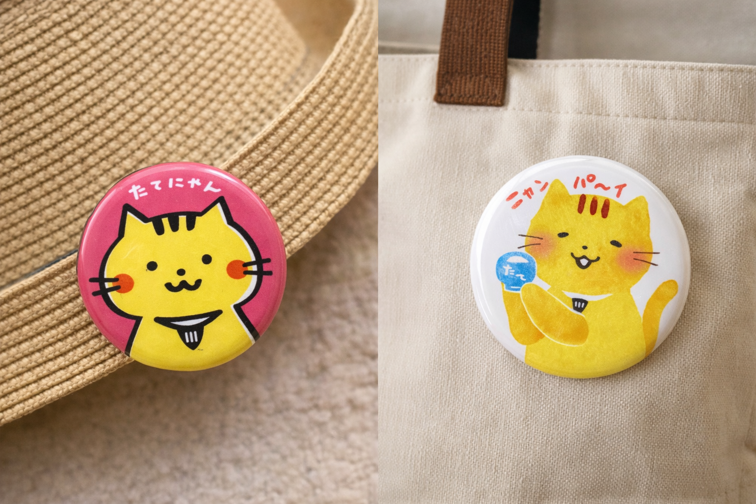 昔からのたてにゃんファンはご存知の「缶バッジ」がひとまわり大きなサイズになって復刻しました。 パペットにも、帽子やバッグ、いつもお使いのアイテムにプラスしていただくと、いつもたてにゃんと一緒です。 サイズ:38mm 2個セット、個包装袋入り