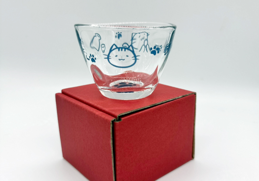 1つ1つ手びねりで作られたグラスで、個性と風合いがあります。そんなグラスにぐるりと一周たてにゃんのデザインを入れました。底は肉球柄になっています。