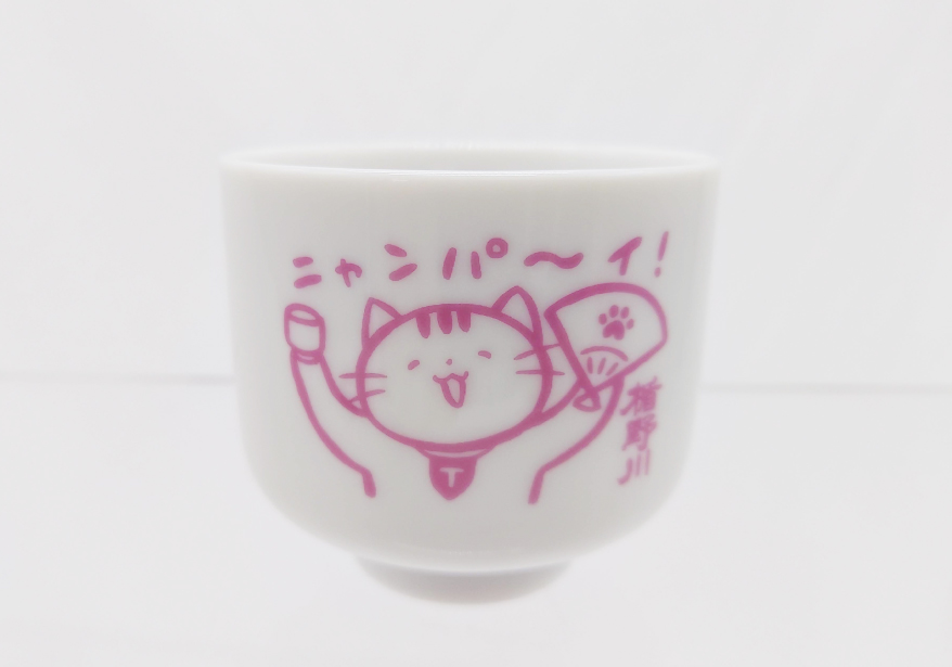 ピンク色の可愛いお猪口が登場! 思わず笑顔になる「ニャンパーイ」と元気いっぱいのたてにゃんです。